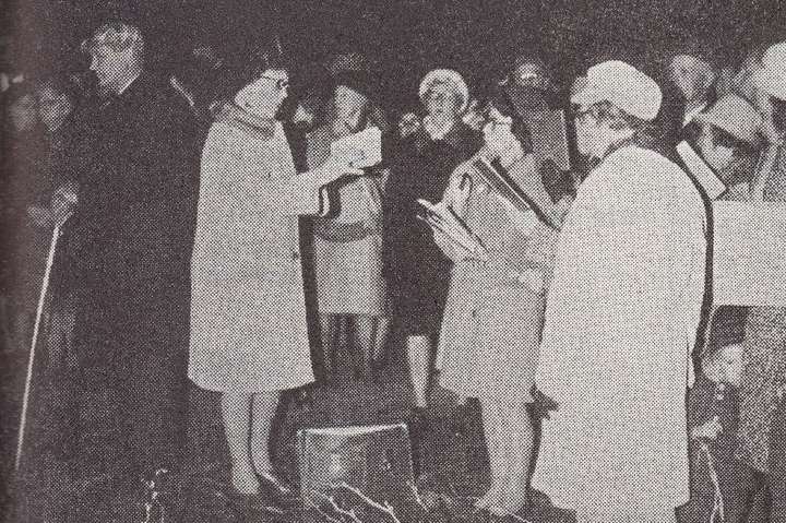 Det var nästan som på nyårsafton. Huvudgatan i Magleby var vackert kantad av marschaller. Raketer kreverade på något hundratal meters höjd över Magleby centrum och spred gnistrande och glimmande stjärnor på himlen. Då och då hördes en och annan smällare. Men det var valborgsmässoafton. Många kvidingebor hade samlats kring majbålet invid affären. Klockan 20 tändes bålet. Lågorna steg snabbt mot skyn. När bålet fått riktig fart talade Oscar Roslund till våren och Kvidinge Sångkör sjöng ”Sköna Maj välkommen”, ”Vintern rasat” och ”Du gamla du fria”. Ett mycket lyckat arrangemang.